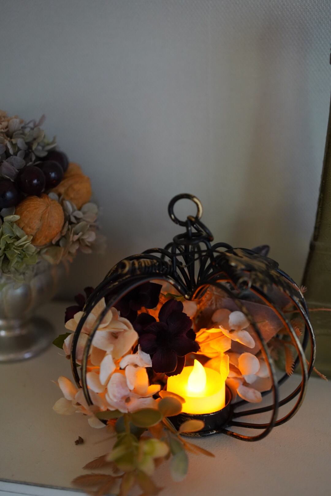 アイアンのパンプキンベースに、アーティフィシャルフラワー をアレンジしました。