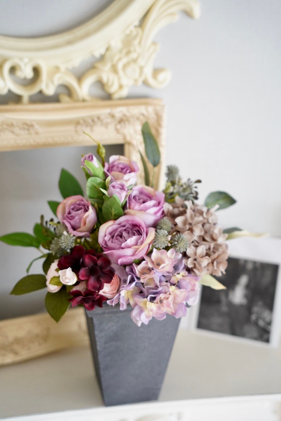 アーティフィシャルフラワーでお作りしたモーヴカラーのパリスタイルフラワーアレンジ