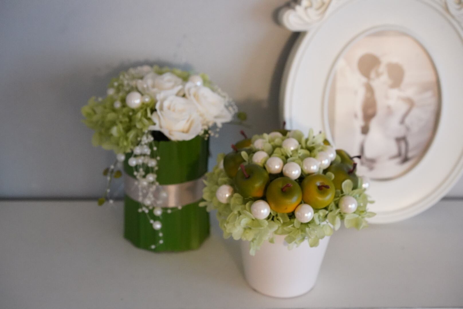プリザーブドフラワーのアジサイ、フェイクのアップルでお作りしました。