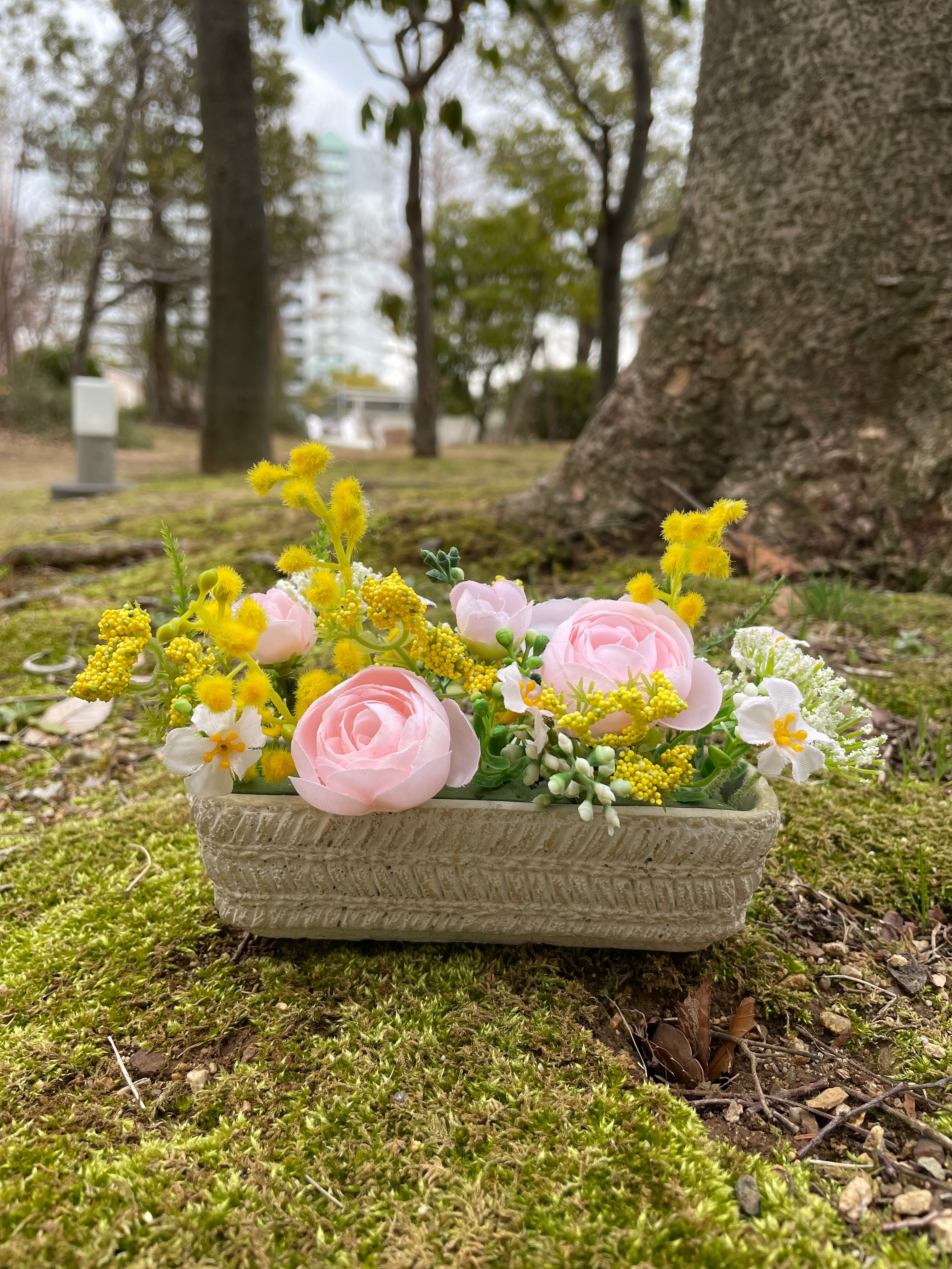 アーティフィシャルフラワーの桃の花、ラナンキュラス、マムなどで、ひな祭りのアレンジをつくりました。