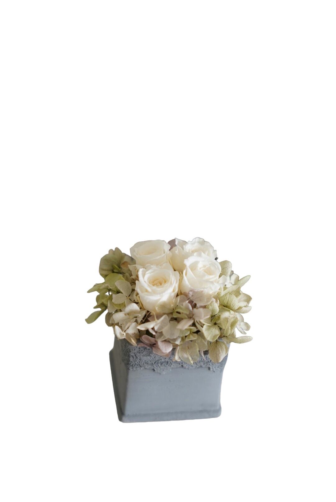 プリザーブドフラワーのローズとあじさいでフレンチシックにアレンジ。