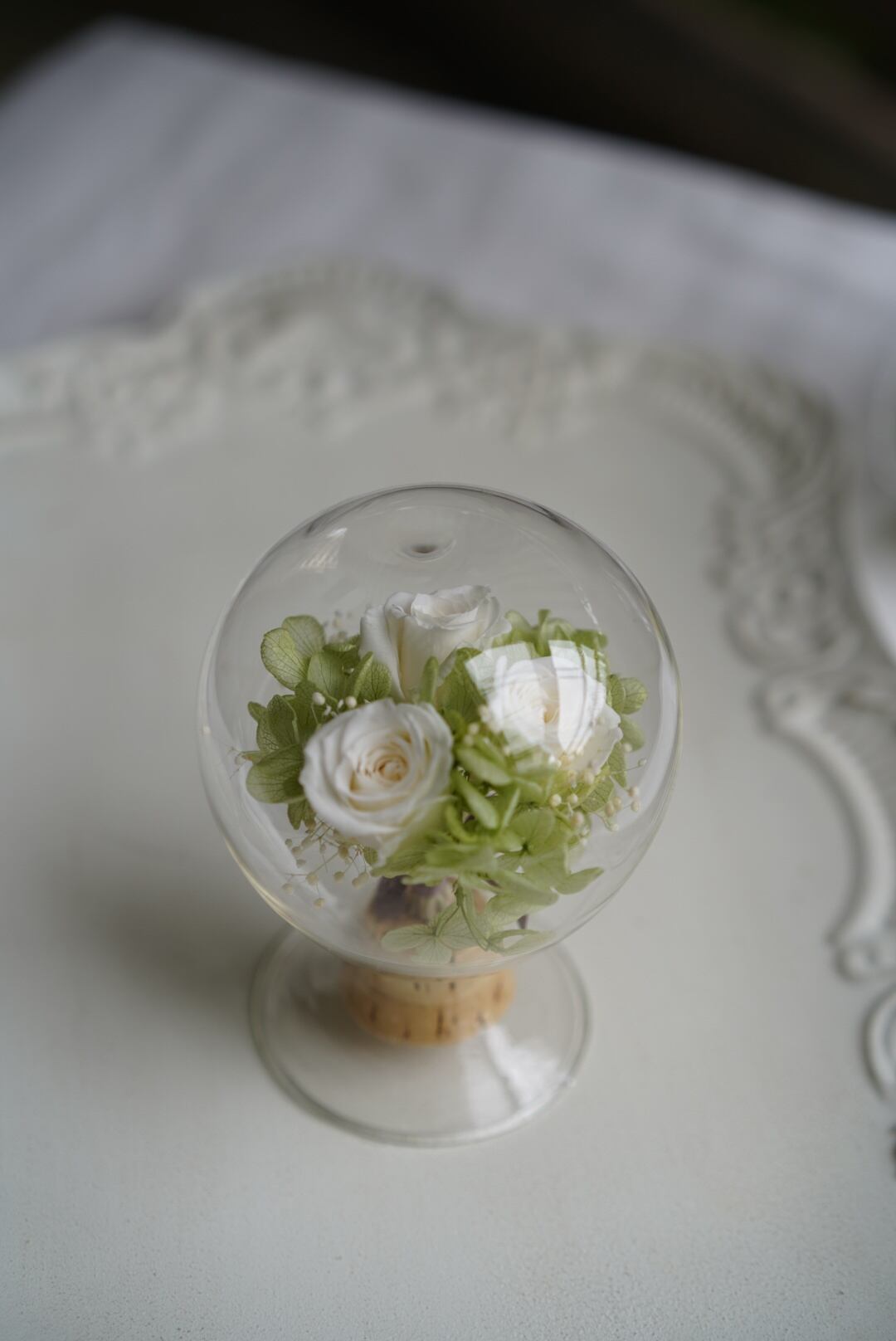 キーワード:香水ボトル型のクリアベースにプリザーブドフラワーをアレンジしました。プレゼントにもお勧め!小さめのアレンジです。