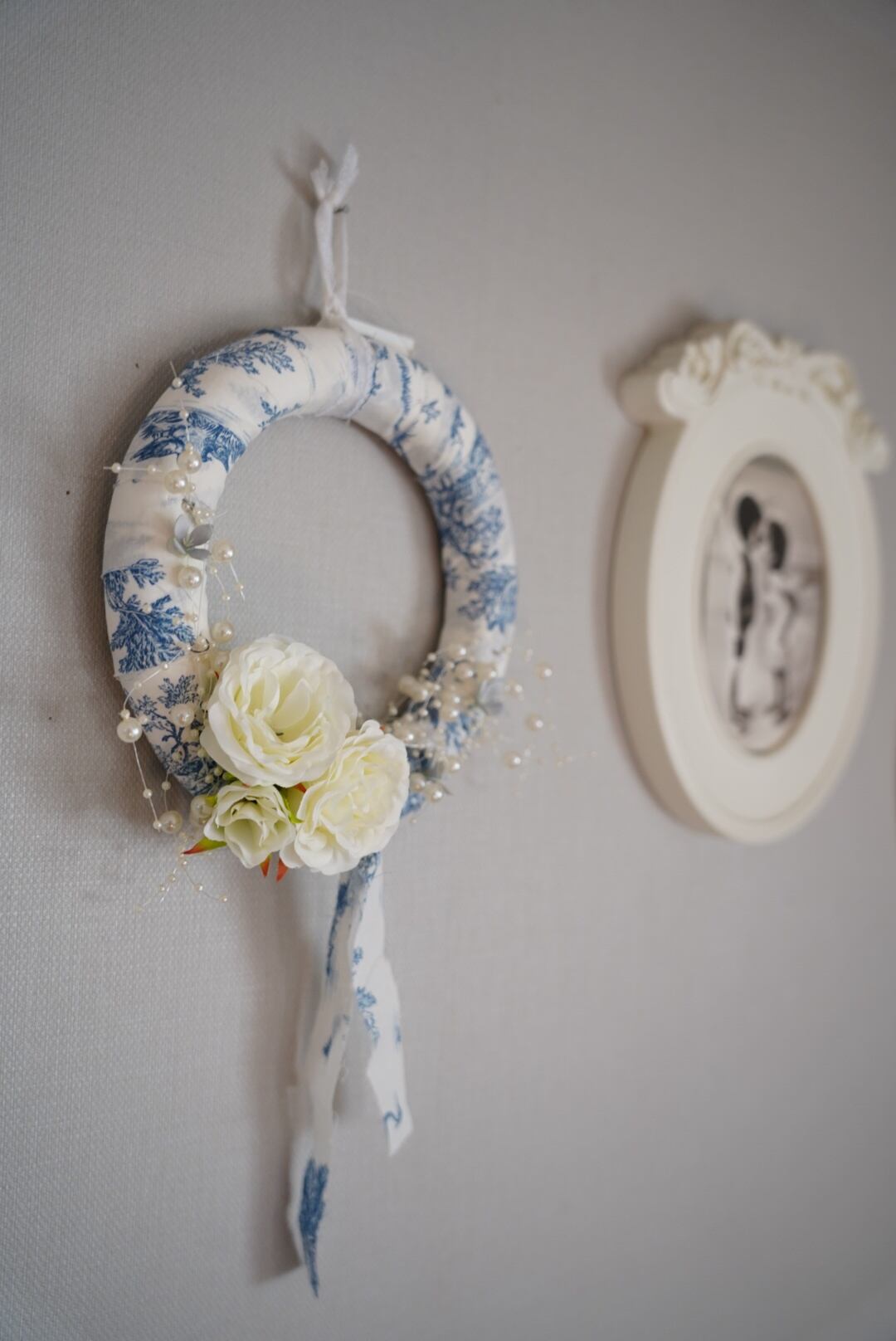 フランス製のトワルドジュイ柄のお生地のリース土台にお花を飾りました。