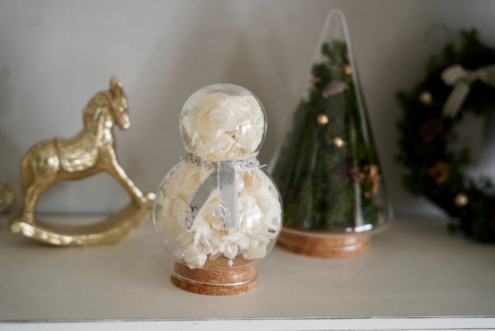 スノーマンの形のガラスボトルにプリザーブド加工のあじさいをデコレーションしました。