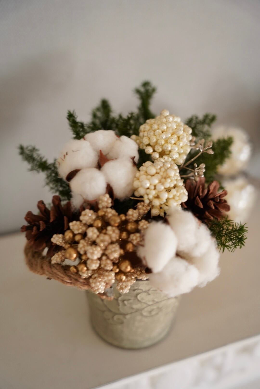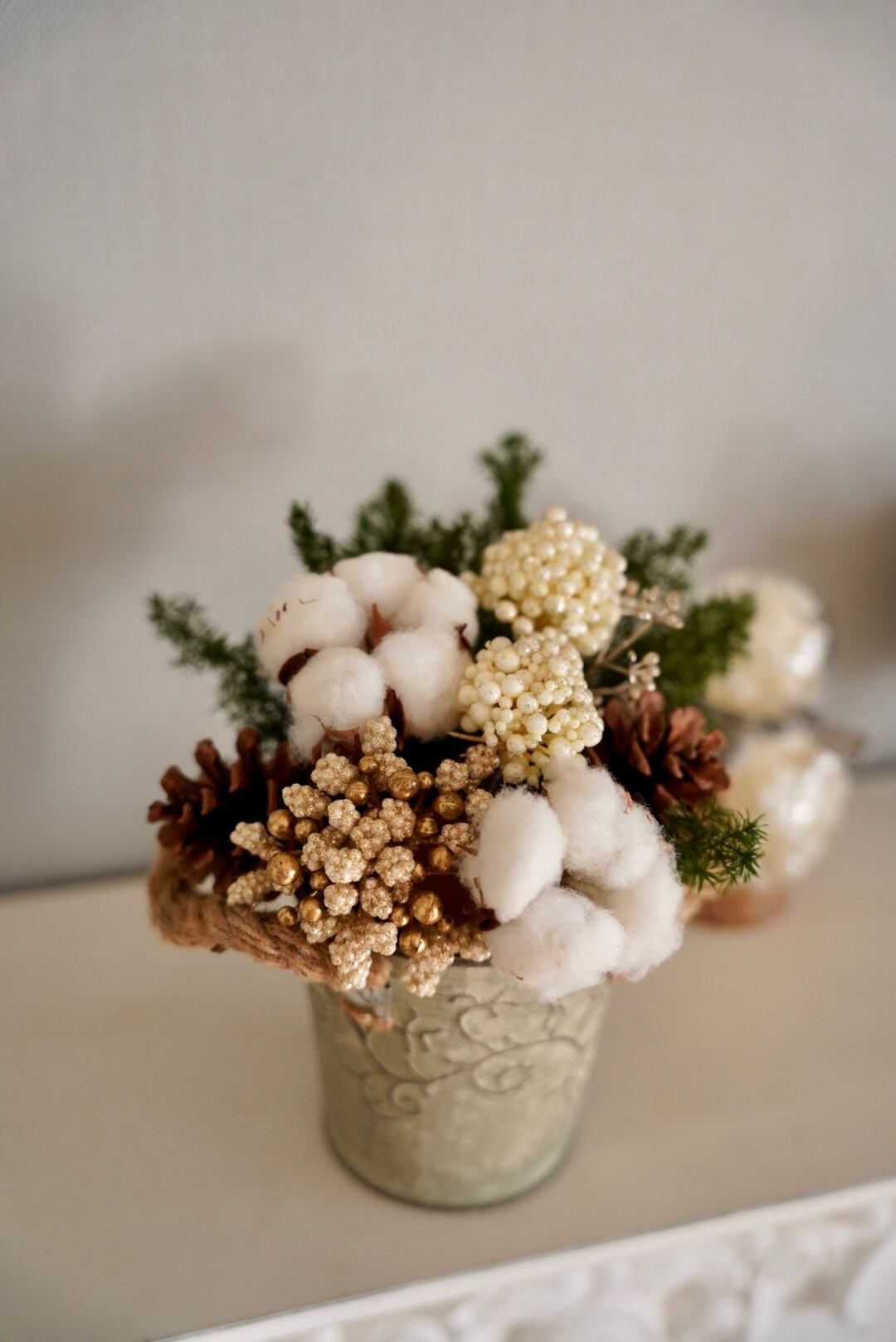 コットンフラワーやプリザーブドの杉、実物を使ってホワイトクリスマスアレンジを作りました。